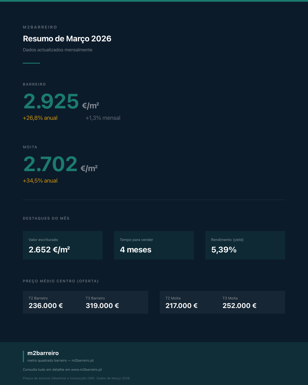 Propriedade dos dados — Os dados apresentados nesta plataforma são propriedade das respectivas fontes originais. O m2barreiro.pt compila, organiza e apresenta informação com a devida atribuição. A reprodução parcial é permitida desde que inclua a referência "Fonte: m2barreiro.pt" e a indicação da fonte original dos dados.
